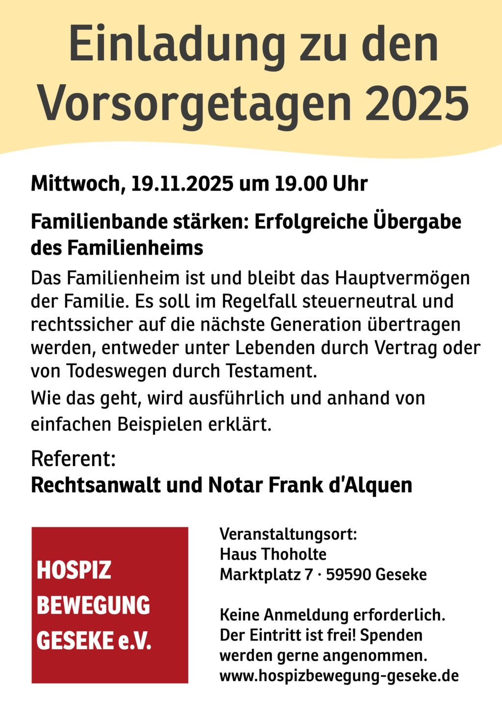 Die Hospizbewegung lädt wieder im Rahmen der Vorsorgetage am 19.11.2025 ins Haus Thoholte ein. Rechtsanwalt Frank d´Alquen wird darüber berichten, wie das Familienheim einvernehmlich an die nächste Generation weitergegeben werden kann. Das kann unter Lebenden oder Todes Weges geschehen.